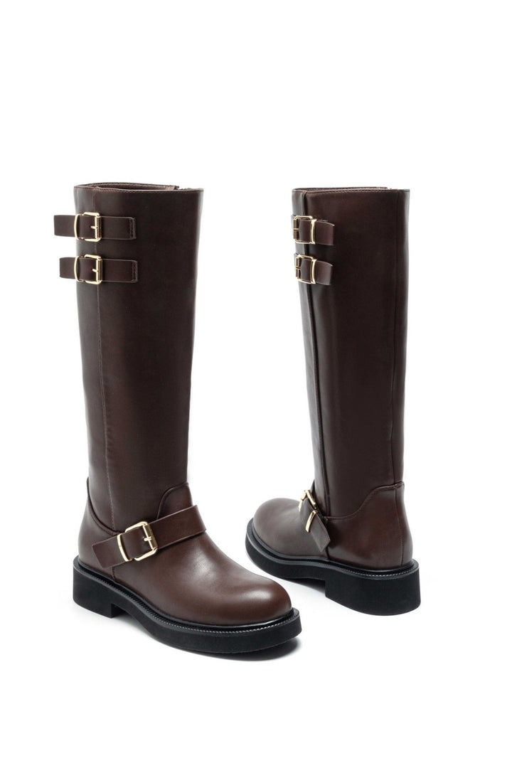 Com o seu design estruturado, detalhes em fivela dourada e acabamento em pele sintética lisa, esta bota é ideal para looks urbanos e sofisticados — da rotina diária às produções mais ousadas.