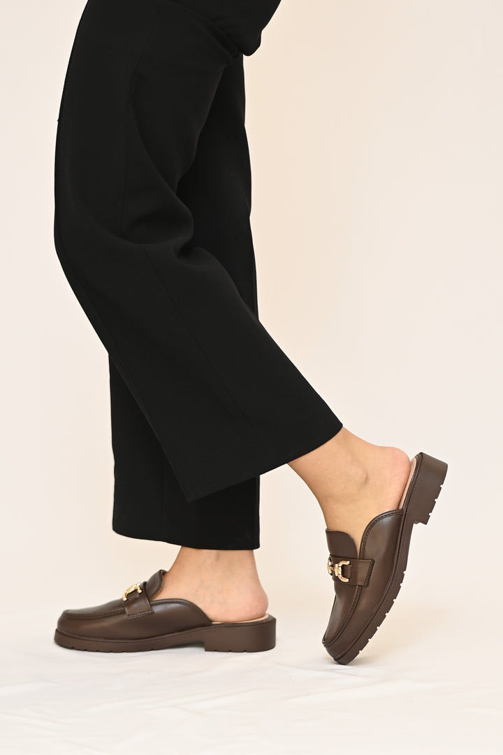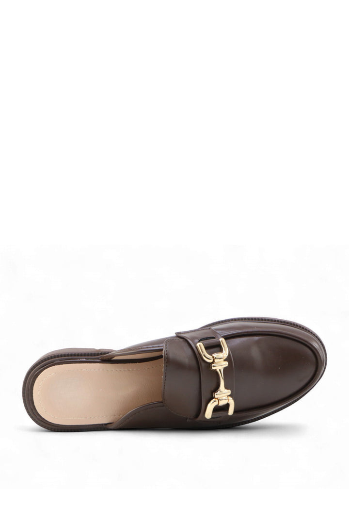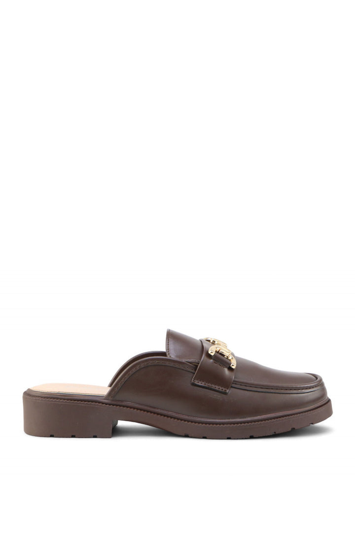 O mule ÉLUNE combina elegância e conforto num design intemporal. Confeccionado em pele sintética com acabamento polido e detalhe dourado na frente, é a escolha perfeita para um look refinado e versátil. Um modelo prático que adiciona um toque de classe a qualquer ocasião.