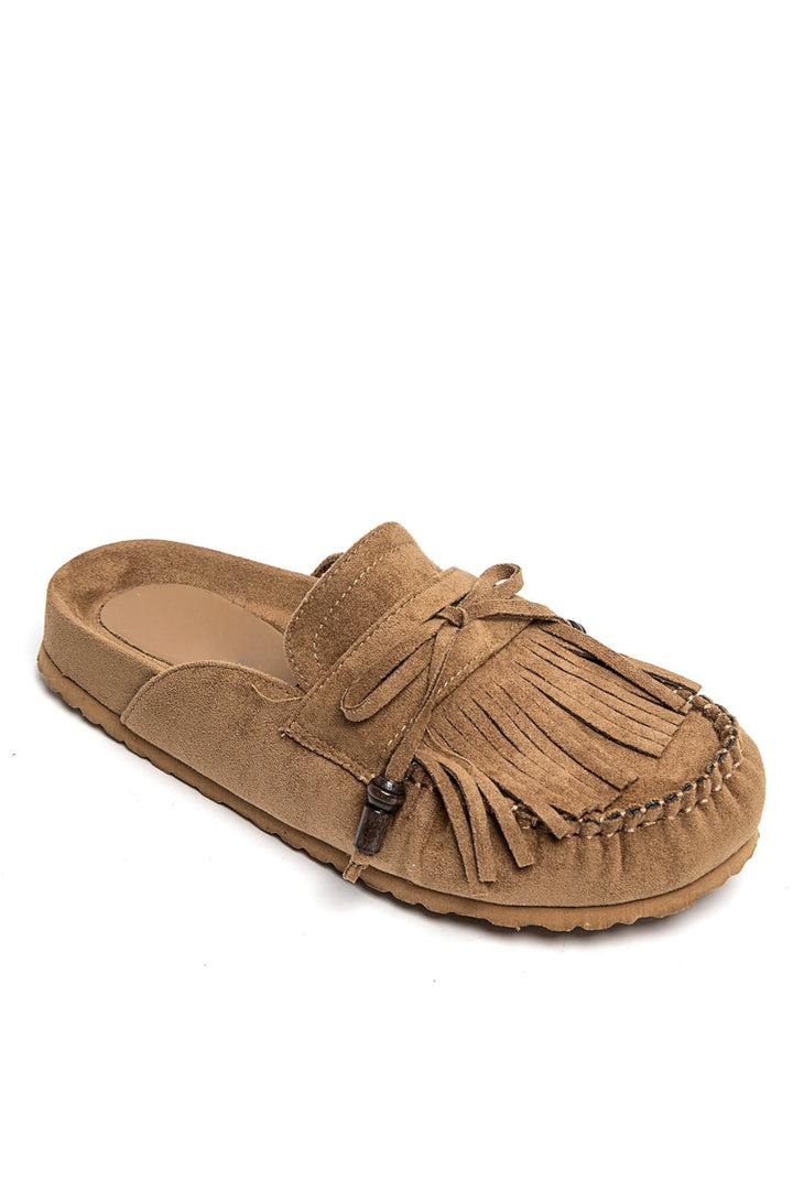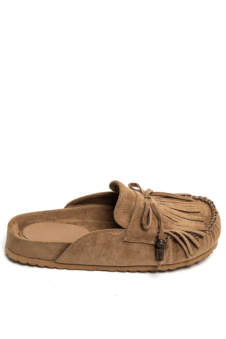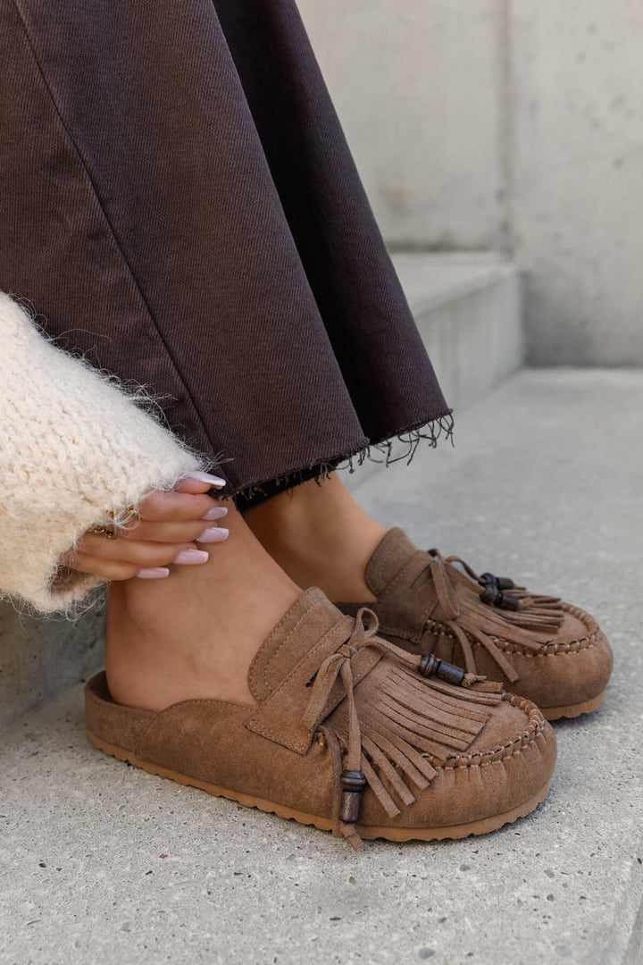 O mule KORA combina conforto e estilo com um toque artesanal. Produzido em camurça suave, apresenta franjas decorativas e detalhe em laço com aplicações que adicionam charme e leveza ao modelo.