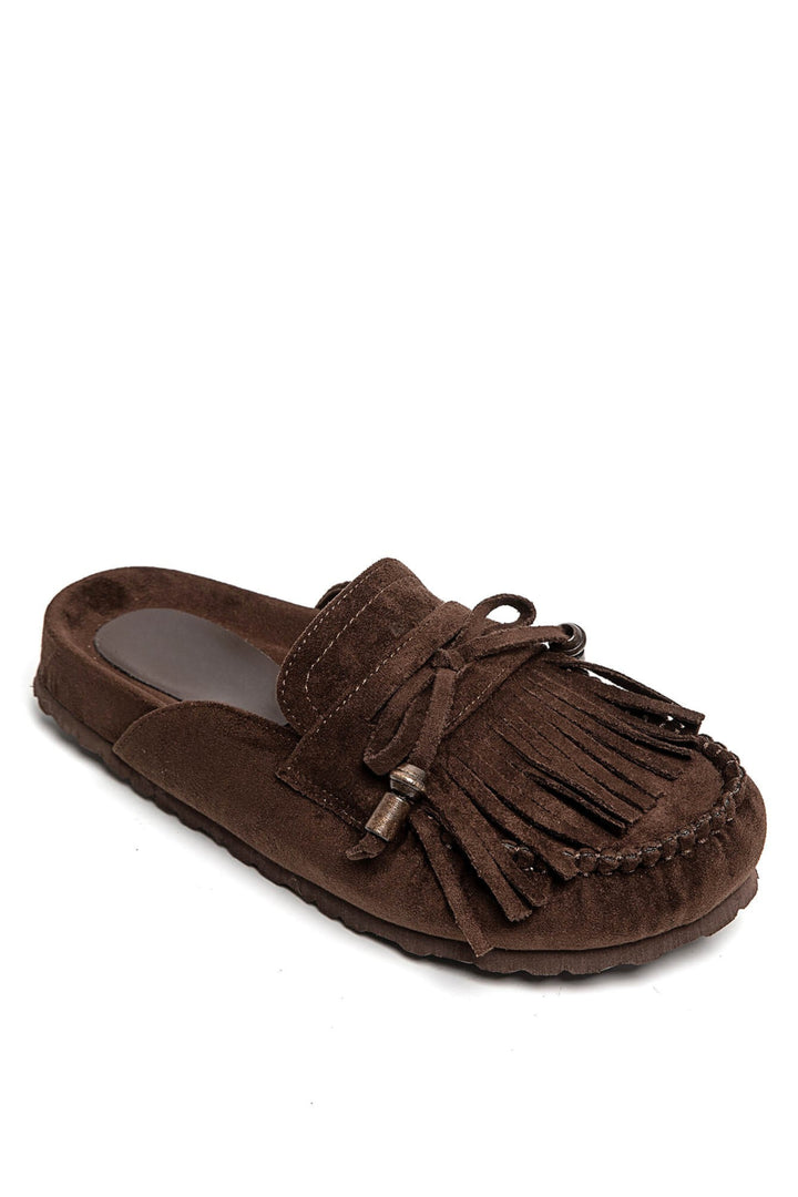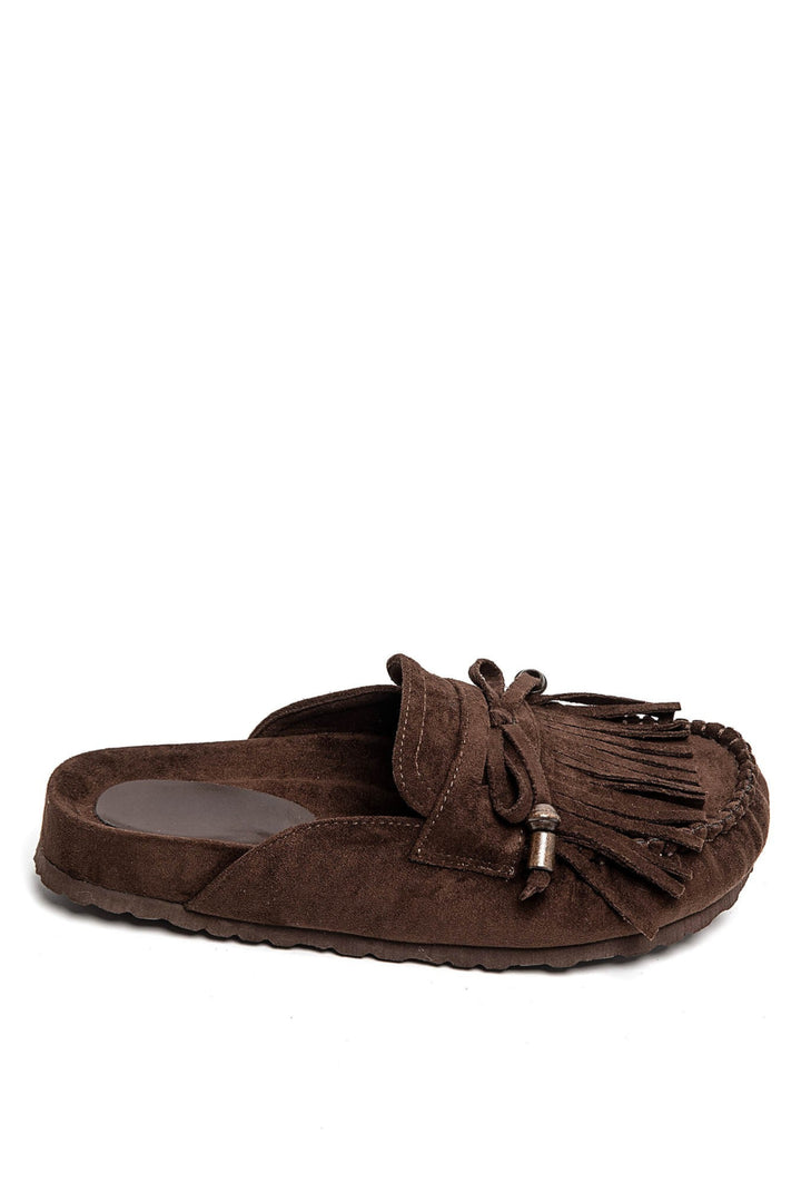 O mule KORA combina conforto e estilo com um toque artesanal. Produzido em camurça suave, apresenta franjas decorativas e detalhe em laço com aplicações que adicionam charme e leveza ao modelo.