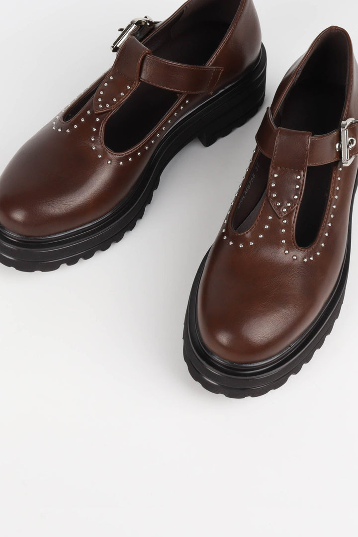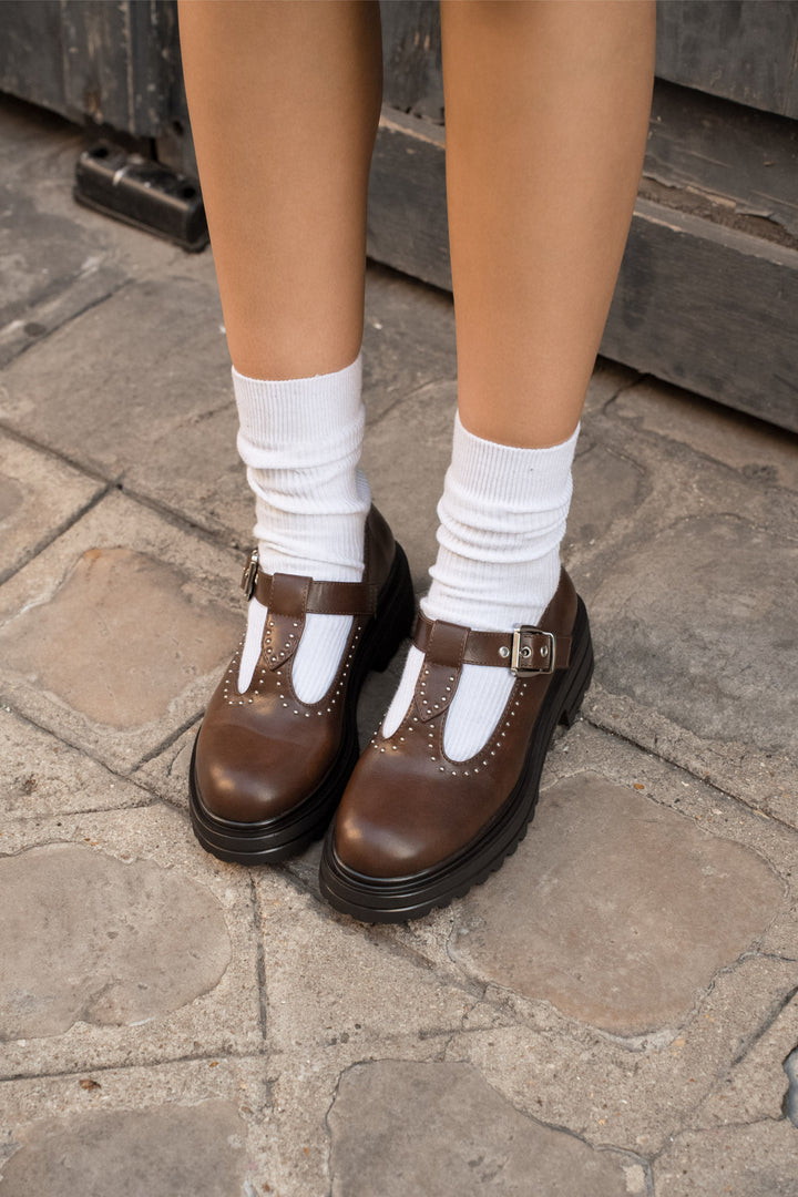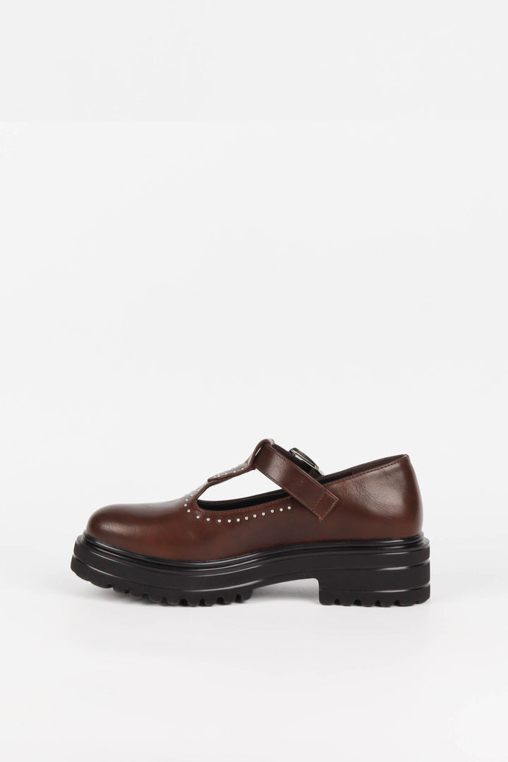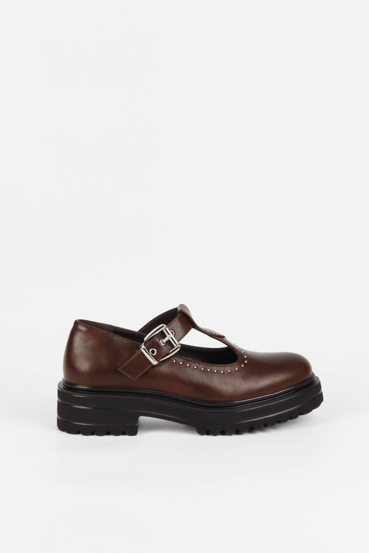 Com o design inspirado nas icónicas Mary Janes, traz uma sola robusta que adiciona personalidade e conforto ao look. O acabamento em tom castanho e os detalhes metálicos dão-lhe um toque sofisticado e versátil — ideal para compor outfits elegantes ou descontraídos.