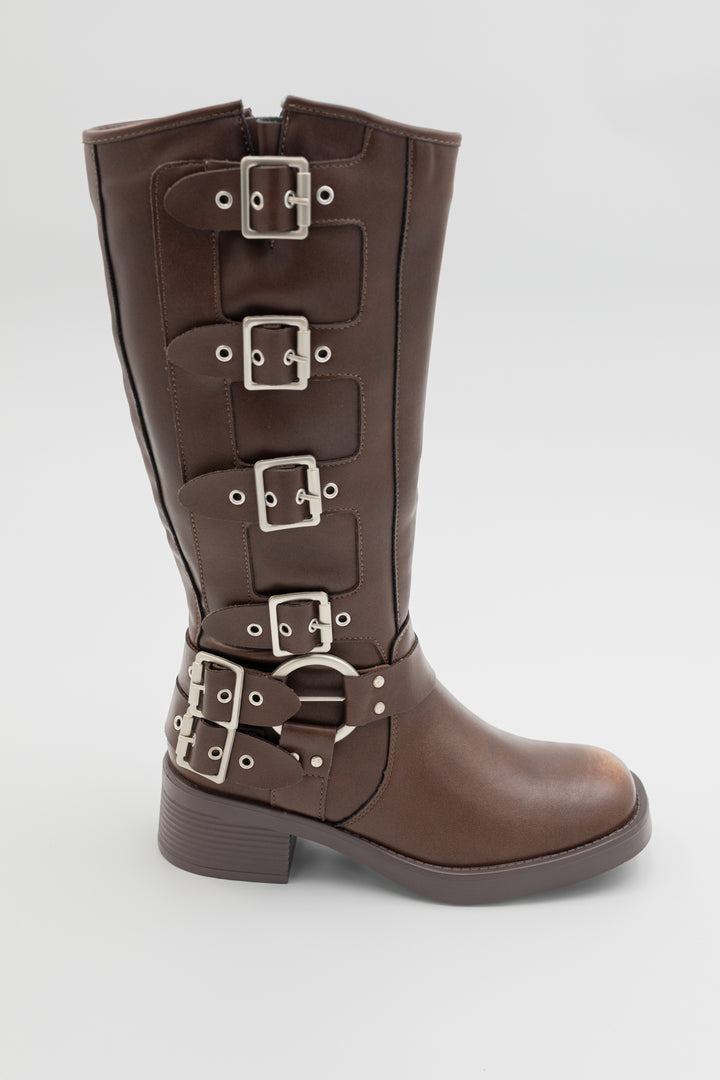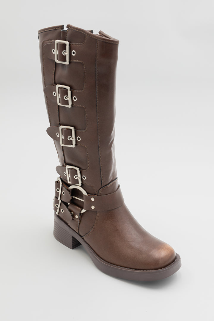 Com fivelas metálicas que conferem personalidade e um design estruturado em pele sintética, é o modelo ideal para elevar qualquer look com um toque ousado e contemporâneo.