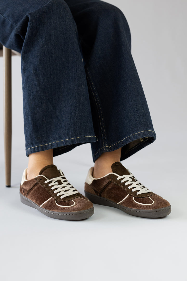 Com textura aveludada em tom castanho e detalhes em off-white, é o par ideal para quem procura um toque sofisticado mesmo nos looks mais descontraídos. Leve, versátil e com sola confortável — o aliado perfeito para o dia a dia.